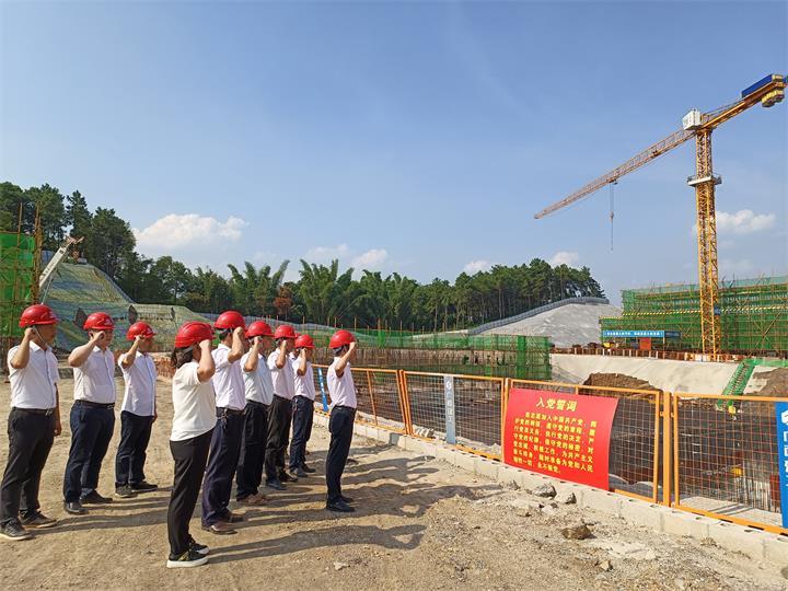 “我志愿加入中國共產(chǎn)黨,擁護黨的綱領(lǐng),遵守黨的章程,履行黨員義務,執(zhí)行黨的決定……”項目建設(shè)施工現(xiàn)場,黨員們面對莊嚴的黨旗,重溫了入黨誓詞。
